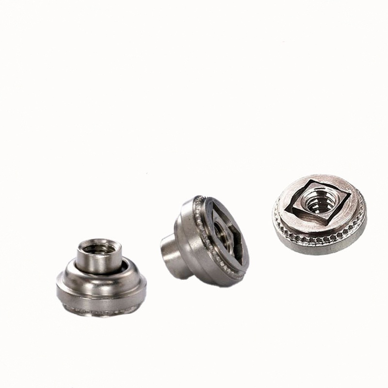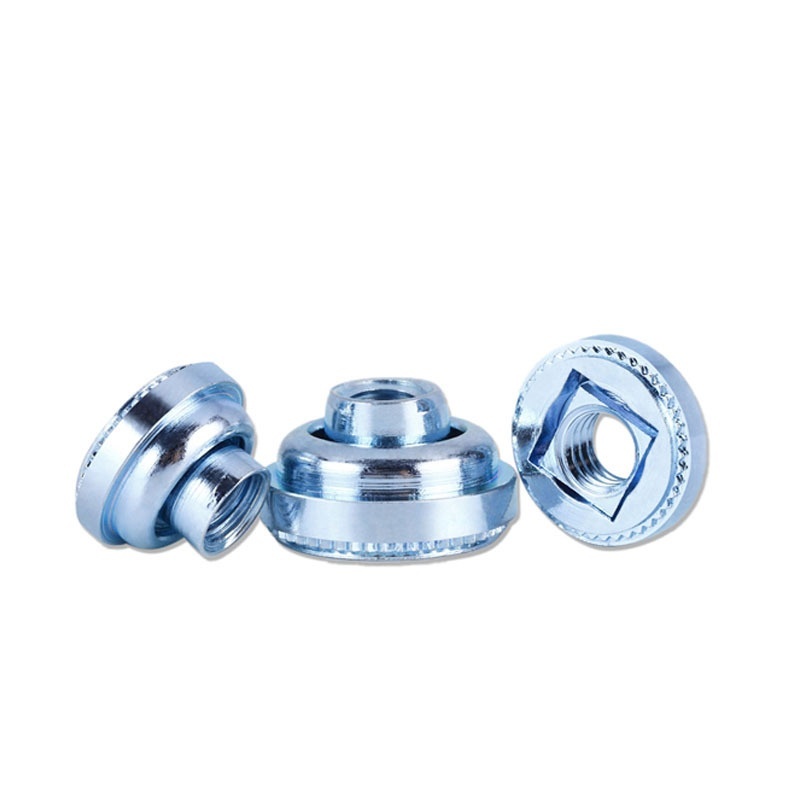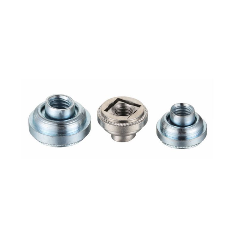 Для встановлення нержавіючих плаваючих довгих горіхів, що нержавіюють, вам потрібен спеціальний гідравлічний або пневматичний інструмент для клевування. По-перше, гайка вставляється в попередньо просвердлений отвір, а потім тиск застосовується за допомогою інструменту. Дно (кулінарна або ребриста частина) притискається в металеву пластину і постійно деформує, замикаючи його на місці.