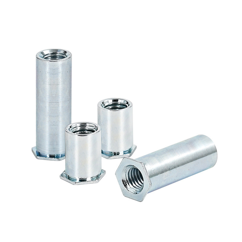 Щоб встановити стовпчик гайки гайки з вуглецевої сталі, ви використовуєте інструмент для гайки заклепки. Шестикутне тіло заважає його крутитися, коли ви кладете його в попередньо просвердлений отвір. Інструмент тягне за головкою оправки, завдяки чому колона рукава нахиляється до задньої частини заготовки. Це створює суцільну, постійну різьбову прив’язку. Відповідність розміру отвору з діаметром стовпчика гайки клепки є дуже важливим, тут не так, і це не спрацює правильно.