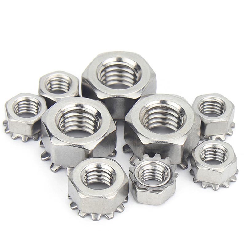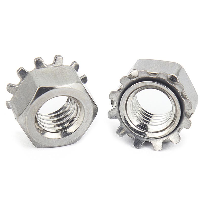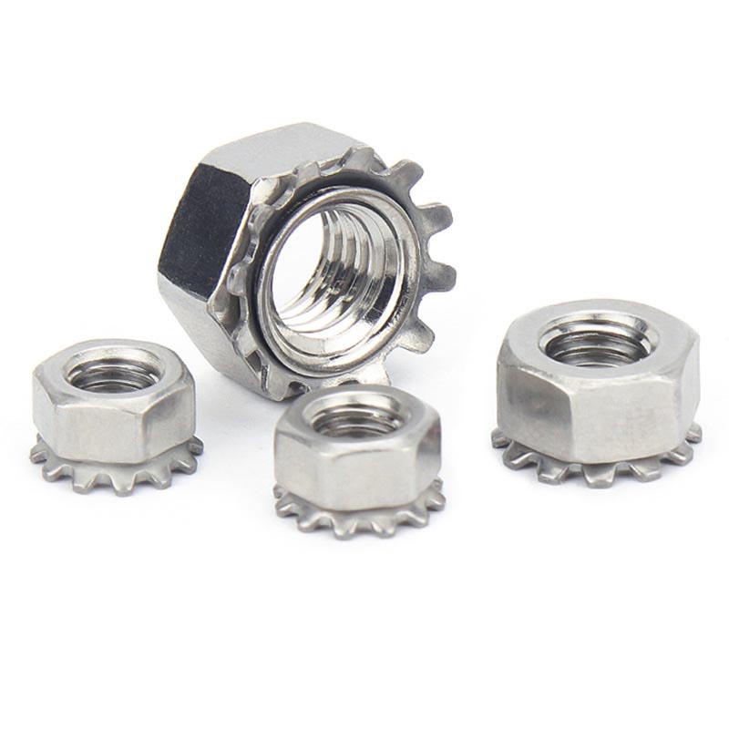 Поєднання горіха з шестикутною пружиною шайбоюПоєднує стандартний шестикутній горіх із пружиною шайбою, злитою до її основи. Розділена конструкція шайби згинається, коли ви затягуєте гайку, створюючи напругу, щоб запобігти розпушуванню. Матеріали, такі як нержавіюча сталь A2, підходять для використання на свіжому повітрі, тоді як шестикутна форма працює з звичайним гайковим ключем. Зуби шайби або хребти копаються на поверхню, щоб збільшити зчеплення.
