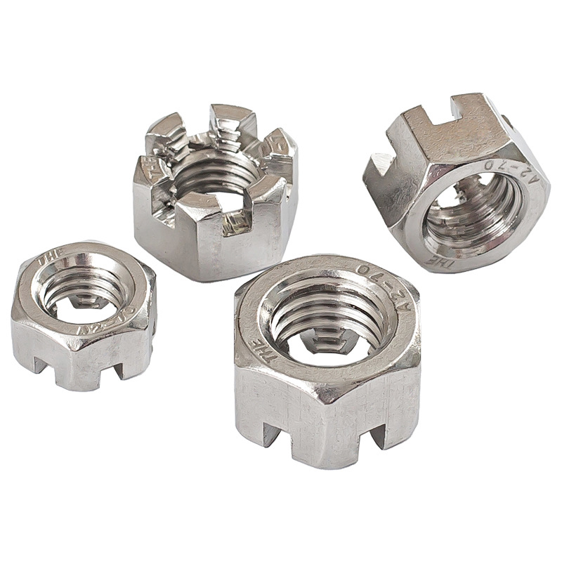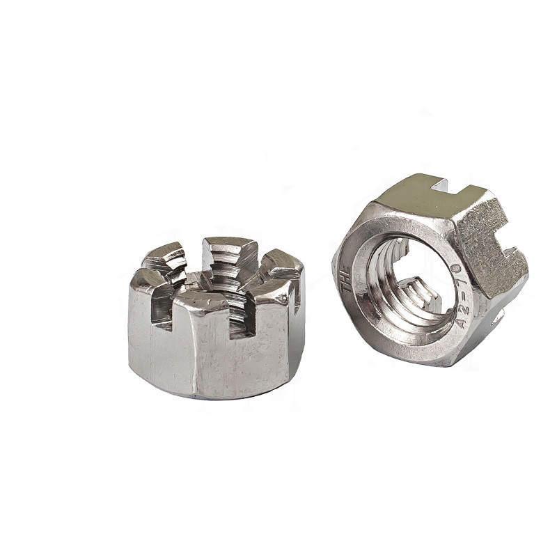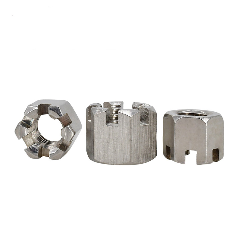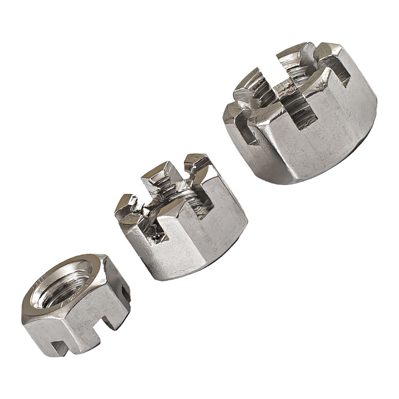 Для ще кращого захисту від іржі та корозії, прорізаний безпечний гайок коронки з прорізами з прорізами доступні з різноманітними цільовими поверхневими обробками: гаряче клапана, додає більш товстий шар цинку для міцного захисту від корозії. Хоча кадмієве покриття широко використовується в аерокосмічній галузі, його використання обмежене в певних сценаріях або за певними стандартами. Спеціальні покриття, такі як геомет та дакромет, також доступні відповідно до потреб захисту від корозії різних середовищ. За допомогою цих методів лікування вони можуть підтримувати хороший стан протягом більш тривалого періоду часу і рідше пошкодитися корозією в сценаріях, де корозію є помітною проблемою (наприклад, вологого та солоного морського середовища та фабричні області з частими контактами з хімічними речовинами). Для щілинних горіхів з нержавіючої сталі пасивація є стандартною. Цей процес видаляє вільне залізо і утворює захисний оксидний шар, максимально використовуючи їх природну здатність протистояти корозії.