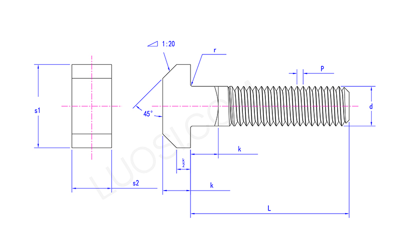 Голова болта квадратної шиї T - це горизонтально розміщена форма "T", як і буква "T". Ця широка Т-подібна головка дозволяє болт застрягнути в Т-подібному канаві обладнання, відіграючи роль у запобіганні витягування болта.