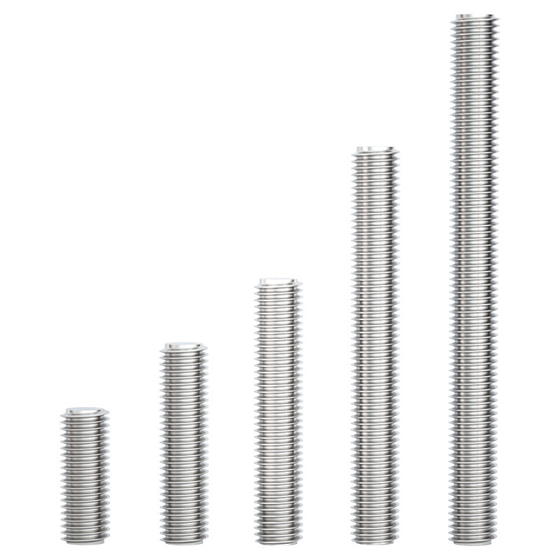 Введіть повні гвинти шпильки для нитки у вигляді струнких циліндрів. Поверхня-це срібний білий оцинкований шар, що містить унікальний блиск та текстуру металу. Все тіло покрите безперервними та рівномірними зовнішніми нитками, з прозорими та звичайними профілями нитки та плоскими кінцями на обох кінцях.